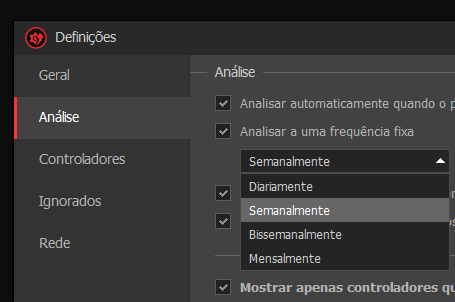 Uma dica para ficar sempre atualizado é clicar nas três barras (deitadas) no canto superior direito do programa (como ilustra a imagem acima) e depois clicando em "Definições..." , então na aba "Geral" você pode configurar para que o programa inicie automaticamente com o Windows e mais abaixo na aba "Análise" você pode configurar para que o Driver Booster busque por drivers desatualizados periodicamente (como ilustra a imagem abaixo).