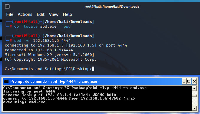 Iniciando o Netcat no Windows em modo escuta passando o executável de sua linha de comando, na máquina Kali basta se conectar à porta configurada na máquina Windows XP (Figura 7) para conseguir realizar um bind shell.
